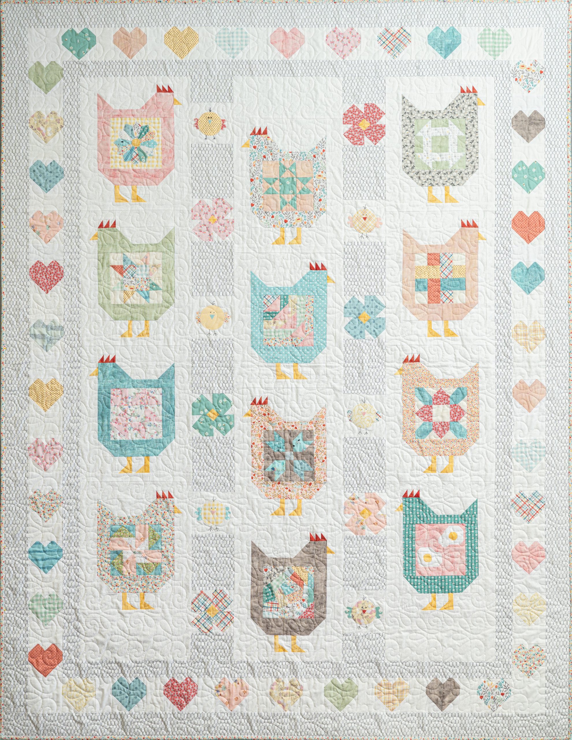 The pattern combines traditional piecing, applique, and paper piecing in one charming quilt. Featuring step-by-step illustrations and full sized templates. Each chicken is highlighting a 6″ block. The sashing has chicken wire, flowers, and baby chicks. It is all surrounded by a border of hearts.